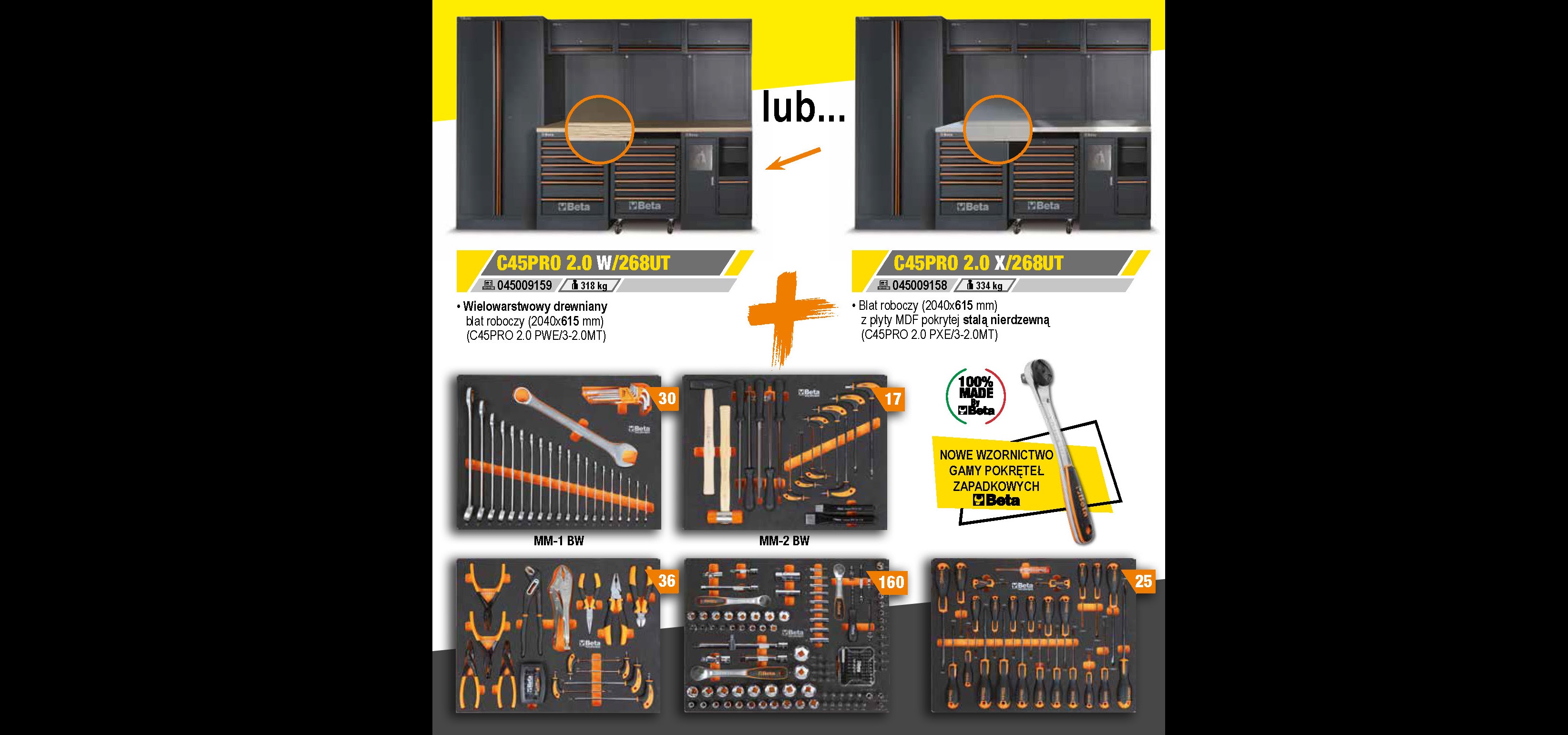 Drodzy Klienci, przypominamy o promocji na zestaw C45PRO 2.0 z 268 narzędziami! Nowa wersja blatu roboczego dostępna we wariantach z drewna wielowarstwowego lub MDF pokrytego stalą nierdzewną o głębokości 61.5cm zapewniająca wygodną przestrzeń roboczą. Nie przegap okazji w cenie 12 165,00 brutto, która trwa do 28.02.2026 roku!